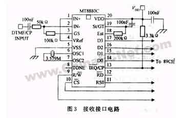 应用MT8880使DTMF信号的收发功能于一体,完成DTMF信号的编码与解码,达到数据传输的目的。大大简化了设计的复杂性,可以降低成本,减少体积。